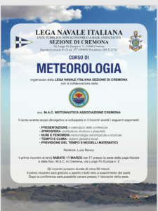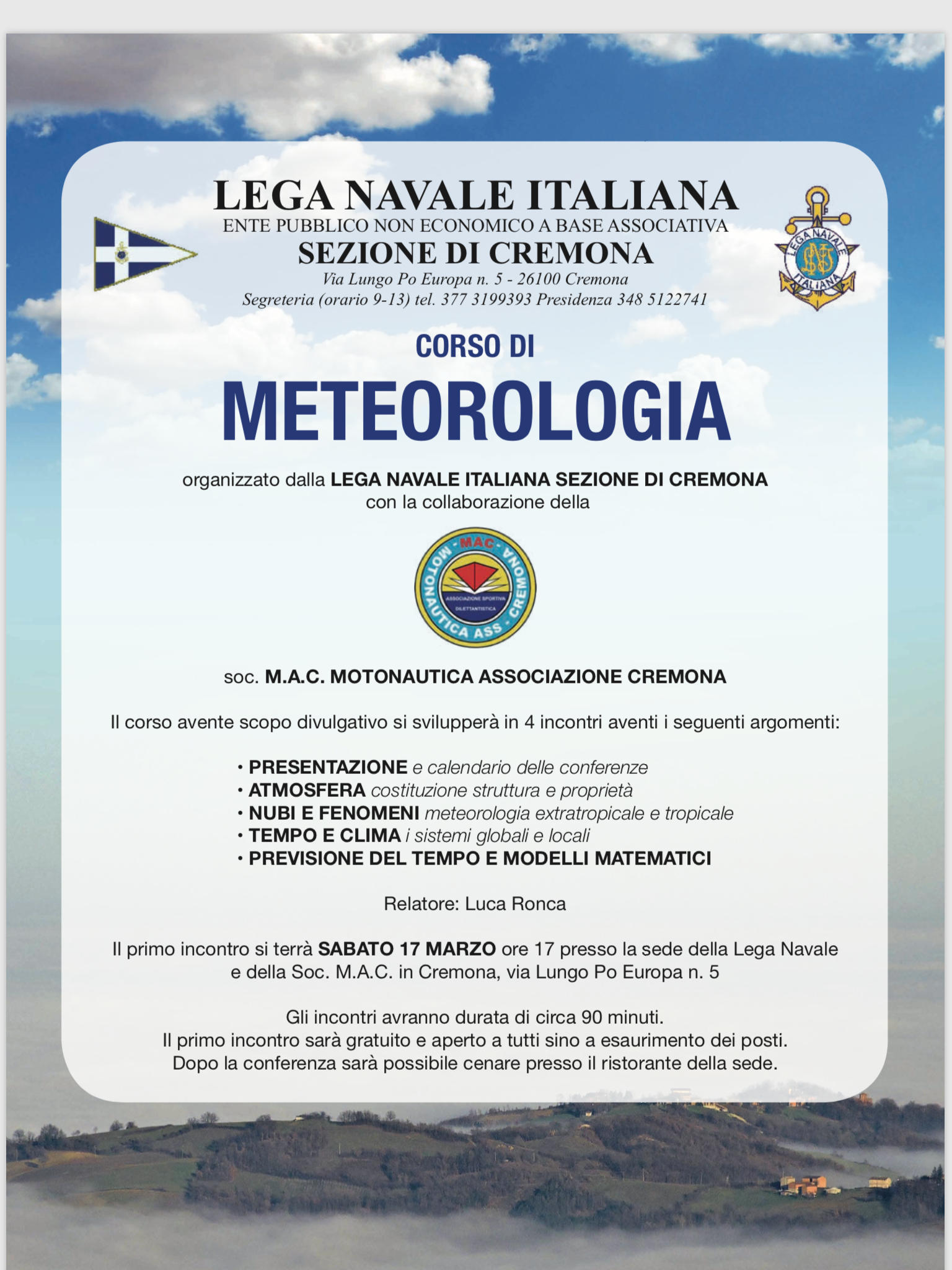 Il corso, che sarà tenuto da Luca Ronca appassionato ed esperto della materia, sarà articolato in quattro incontri, il primo: presentazione e “Atmosfera costituzione struttura e proprietà”, è fissato per sabato 17.3.2018 ore 17 presso la sede in via Lungo Po Europa 5 a Cremona.