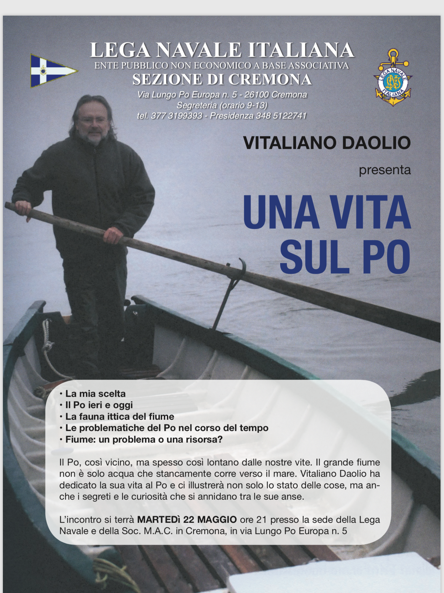 Martedì 22 maggio, presso la sede della Lega Navale Sezione di Cremona in via Lungo Po Europa 5, si terrà la conferenza “Una vita sul Po” di Vitaliano Daolio gestore dell’acquario del Po e del Po Fishing Center di Motta Baluffi (CR).