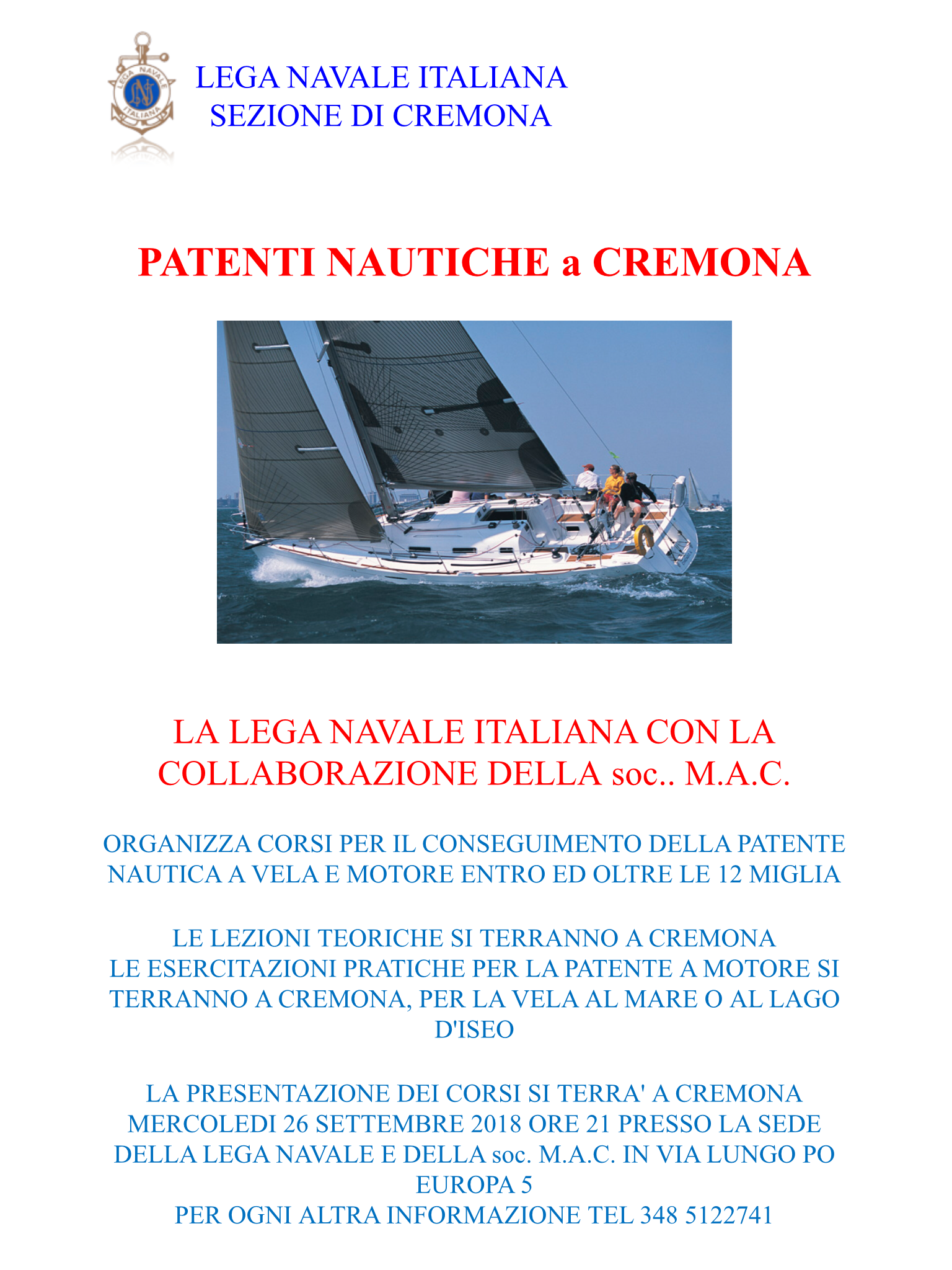 LA LEGA NAVALE ITALIANA CON LA COLLABORAZIONE DELLA soc.. M.A.C. ORGANIZZA CORSI PER IL CONSEGUIMENTO DELLA PATENTE NAUTICA A VELA E MOTORE ENTRO ED OLTRE LE 12 MIGLIA LE LEZIONI TEORICHE SI TERRANNO A CREMONA LE ESERCITAZIONI PRATICHE PER LA...