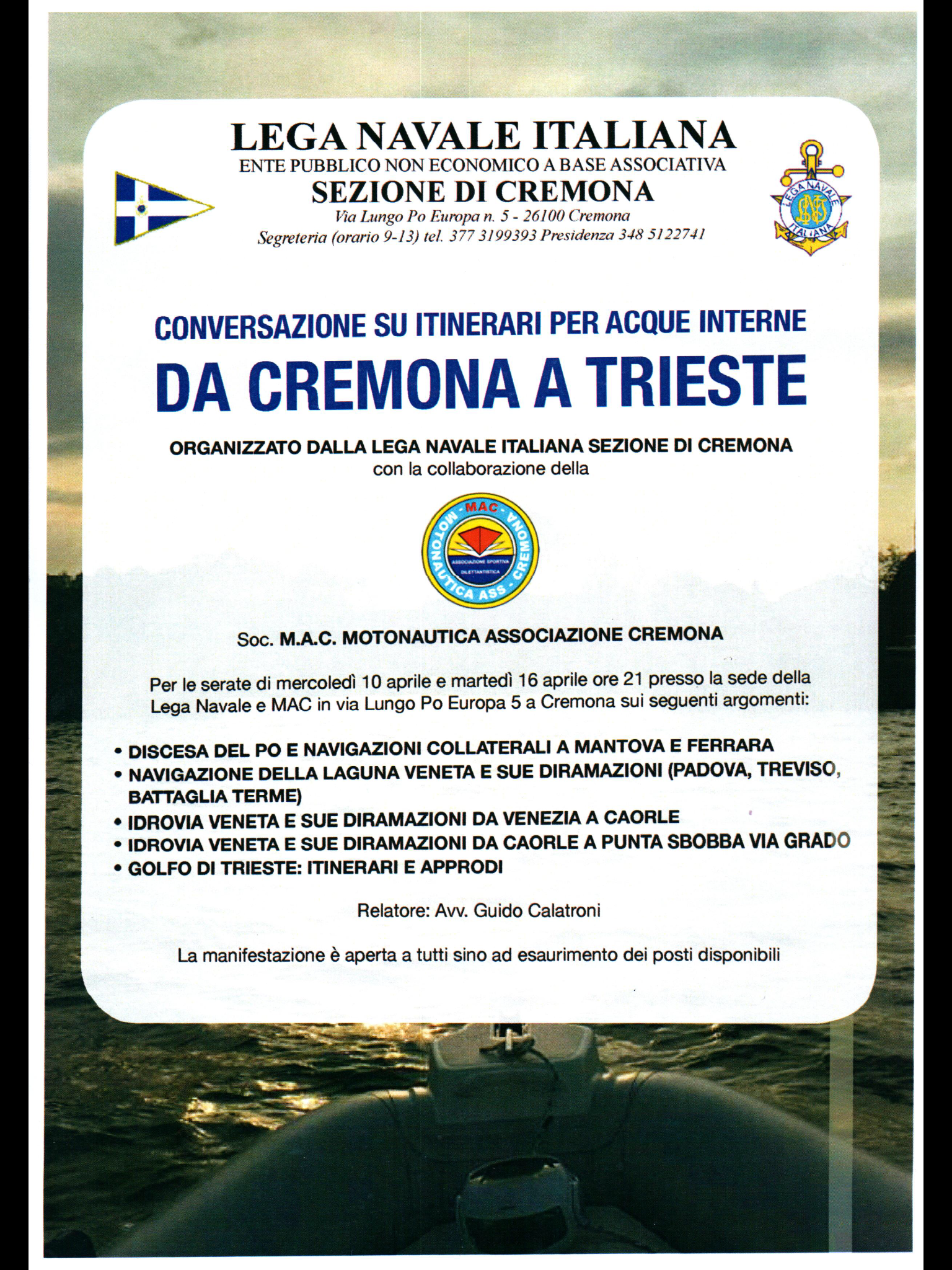 La LEGA NAVALE sezione di Cremona, con la collaborazione della M.A.C. MOTONAUTICA ASSOCIAZIONE CREMONA, organizza una conferenza per la navigazione delle acque interne da Cremona aTrieste. L’appuntamento è per Mercoledì 10 e Martedì 16 Aprile presso la sede della Lega...