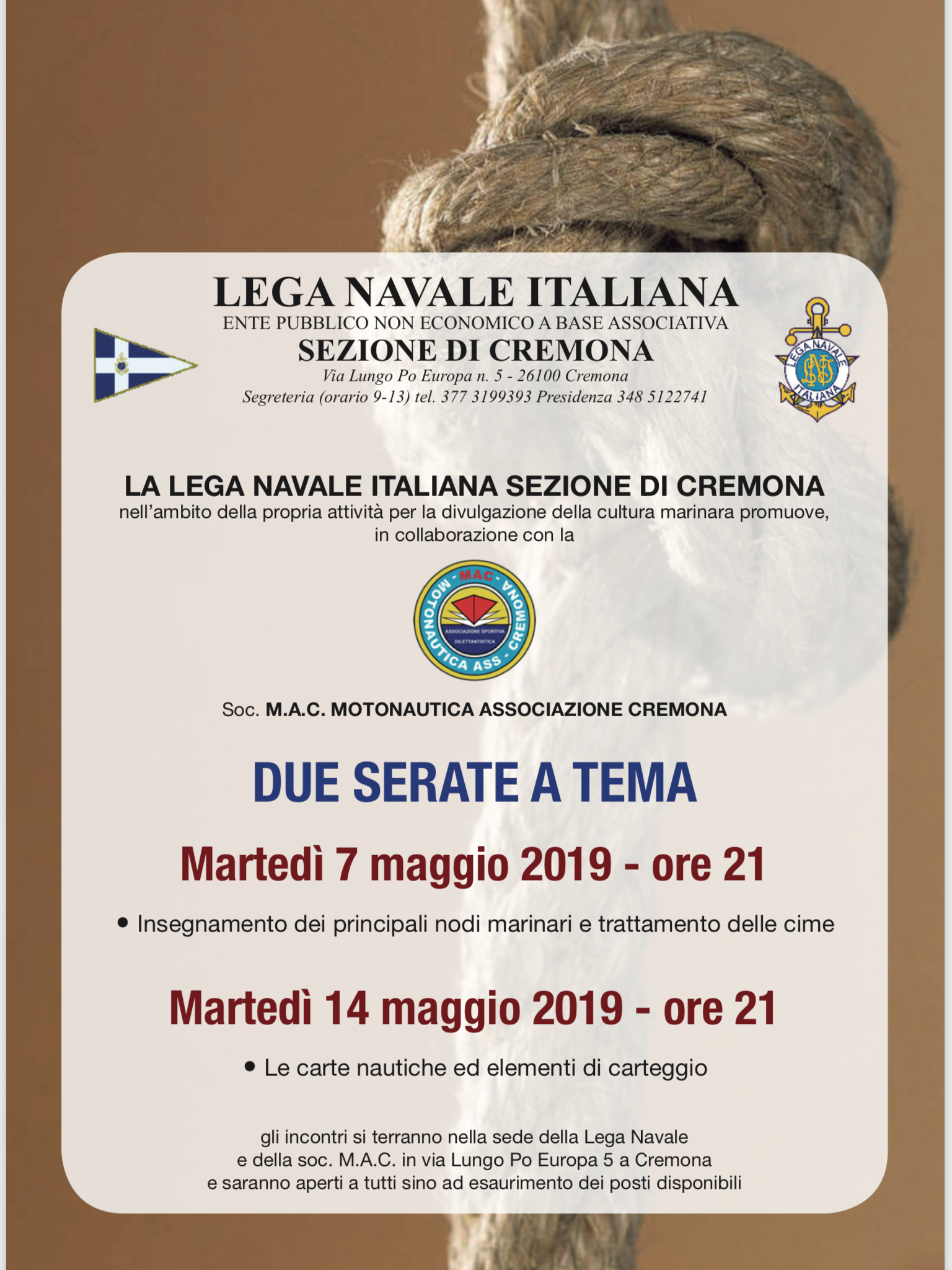 La Lega Navale Sezione di Cremona organizza un corso sui principali nodi marinari e sulle caratteristiche delle carte nautiche e modalità di carteggio. I corsi si terranno in due serate: Martedi 7 Maggio si terrà il corso sui Nodi marinari....